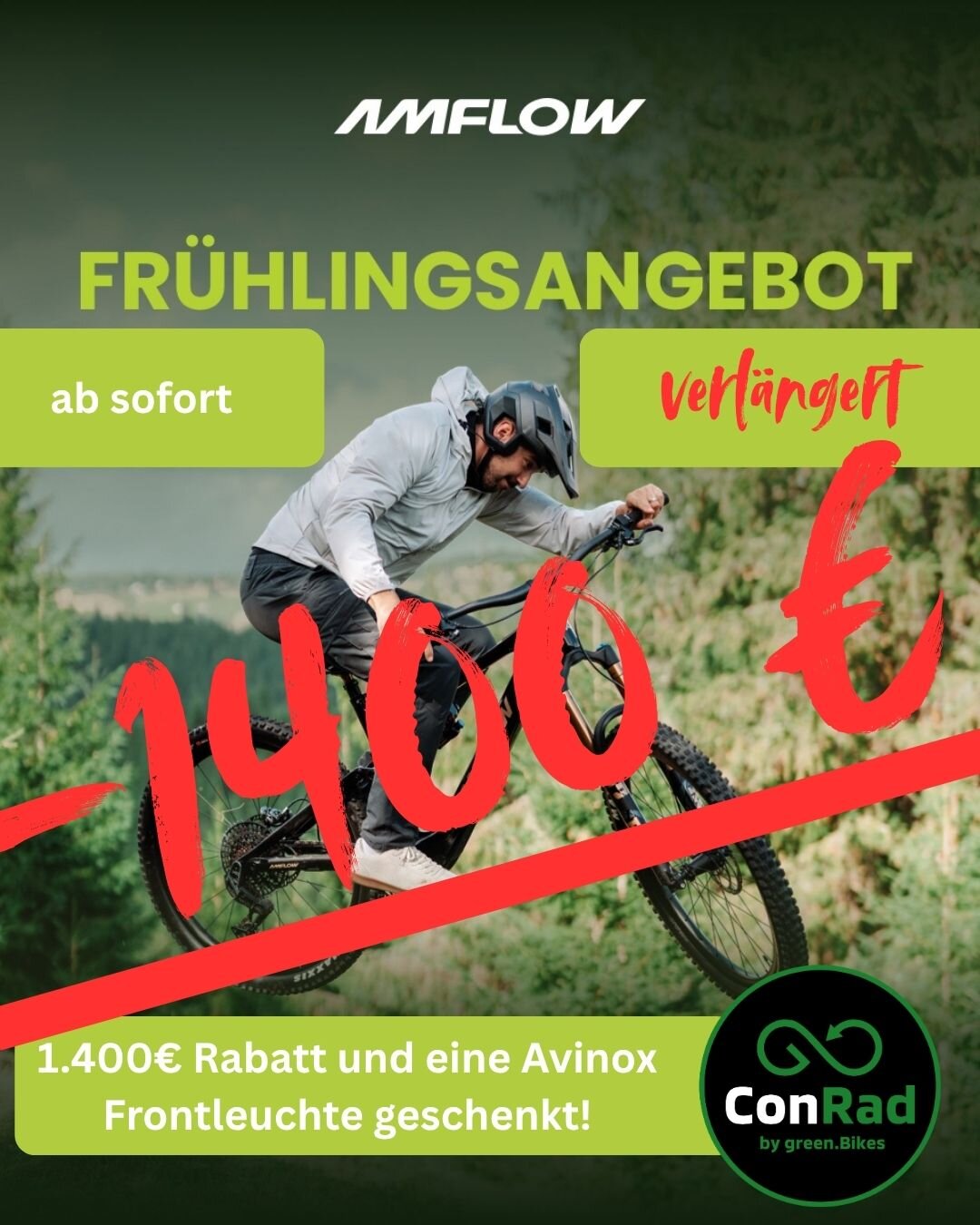 Bis Ende April (Aktivierung des Bikes ist vorrausgesetzt) könnt ihr euch das Topmodell von Amflow für -1.400€ sichern und eine gratis Frontleuchte von Avinox gibt es auch noch dazu! Es zählt schnell zu sein, die Verfügbarkeit sinkt logischerweise täglich, Nachbestellungen sind nur begrenzt möglich. Bei Leasing und Finanzierung gelten Abschläge, diese bitte vor Ort erfragen.